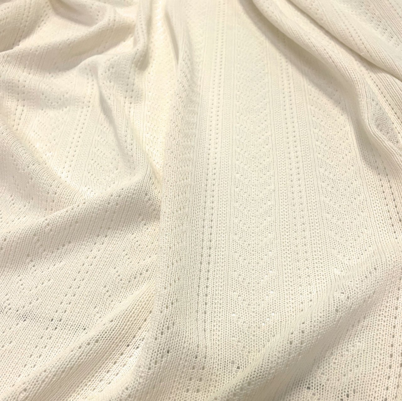 Мягкое трикотажное полотно ажурной машинной вязки.. Одежда из этой ткани может быть просторной в спортивном стиле и облегающей подчеркивая достоинства фигуры. Летние сарафаны, брюки, туники будут прекрасно смотреться. Стирка в машинке на 30 градусов, ручной режим.